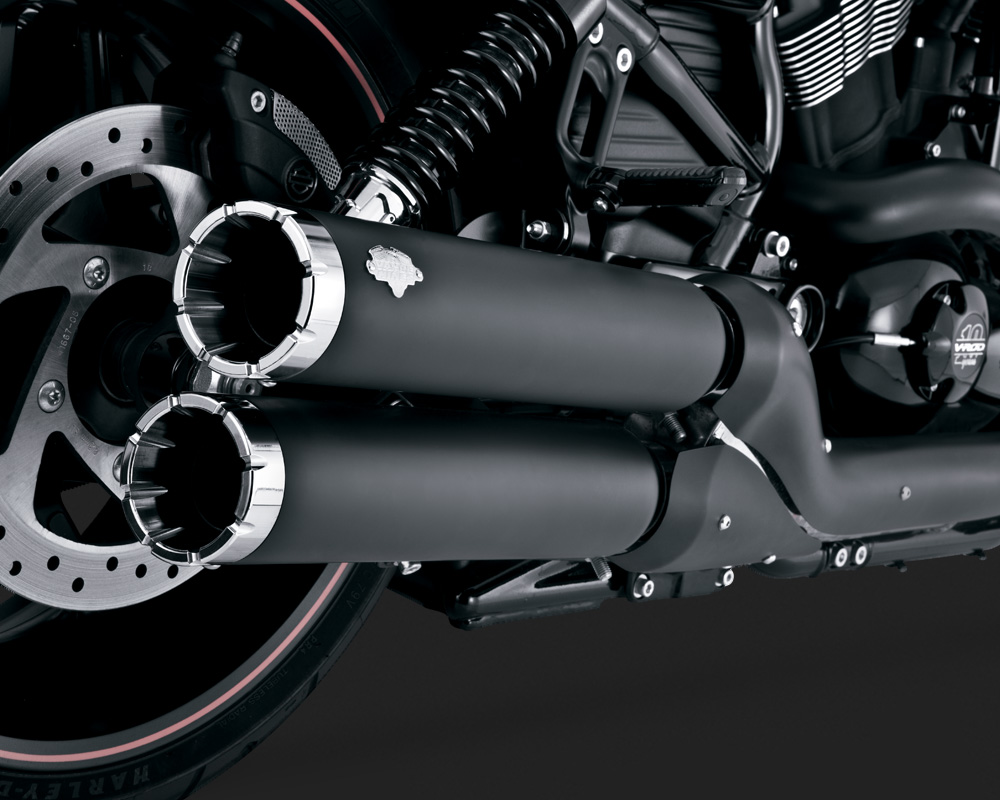 Treading deeper into the dark, Widow Slip-ons in black are available for the Night Rod and Night Rod Special, these slip-on mufflers carry the signature look of our black line; race quality black ceramic coating with machined billet end caps and riveted Vance & Hines badge in chrome.
